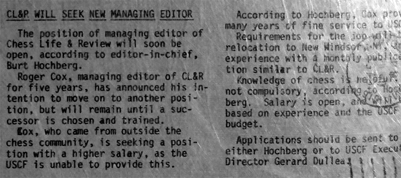 It was a juicy one: 36 pages of complaint and outrage about the state of U.S. chess. I ploughed through it all and was probably exhausted as I came to the end. So perhaps it was even luck that I found myself peering at an obvious last-minute notice shoehorned in on the bottom of the last page: “Chess Life & Review Will Seek New Managing Editor.” See the illustration for the actual artifact.
